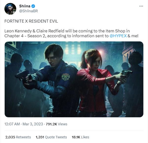 根據泄露消息,此次《堡壘之夜》聯動的皮膚將是里昂與克萊爾,雖然角色的服裝尚未確定,但粉絲們希望每個角色至少有兩種不同的風格。泄漏日期表明聯動皮膚將在3月初開始的第4章第2季中上線。