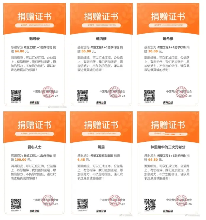 或是受到了該角色善舉的觸動,《原神》玩家紛紛開始自發向「希望工程」捐款,並在網路上曬出自己的捐贈證書。