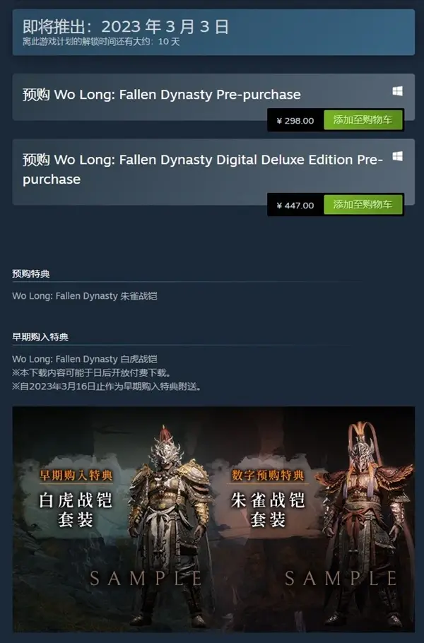 普通實體版:購買平台為 PlayStation®5 / PlayStation®4;預購獎勵:特典「白虎戰鎧套裝」。