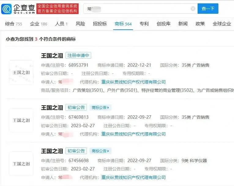 據企查查APP顯示,自然人常姓人員同時搶注多枚「塞爾達傳說曠野之息」「塞爾達傳說王國之淚」「王國之淚」商標,其中「塞爾達傳說 曠野之息」於2021年搶注成功,續作「王國之淚」商標近期正進行初審公告。
