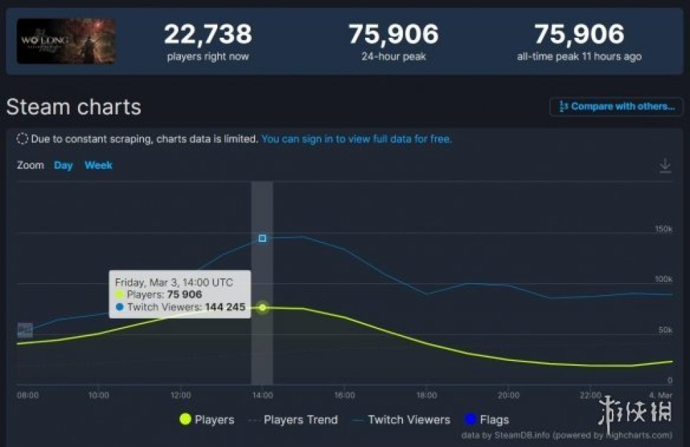 《卧龍:蒼天隕落》已於3月3日正式登陸Steam平台,這款類魂動作遊戲推出以後非常火爆,SteamDB的數據顯示,在遊戲發售當天(3月3日),該遊戲的同時在線玩家人數峰值接近76000人(75,906人)!