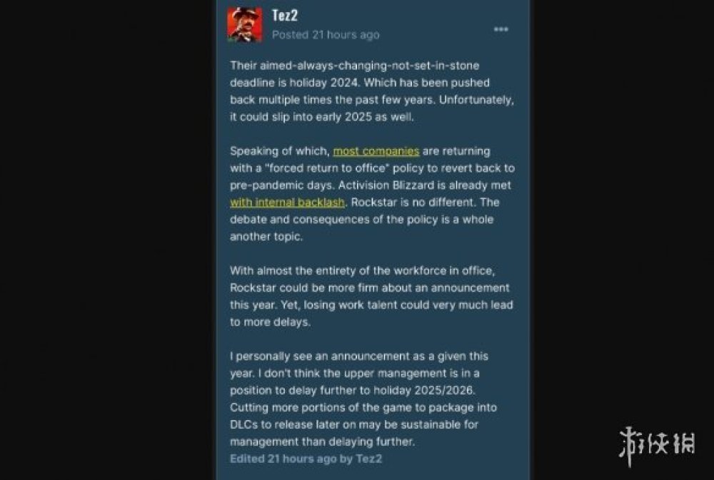 Tez2還提到,由於國外疫情逐漸平穩,大多數公司都採取了「強制復工」政策,R星也不例外,在幾乎全員都來公司上班的情況下,R星在2023年正式公布《GTA6》的可能性很大。