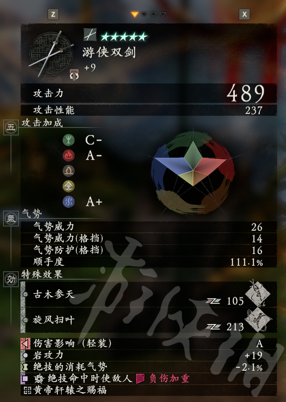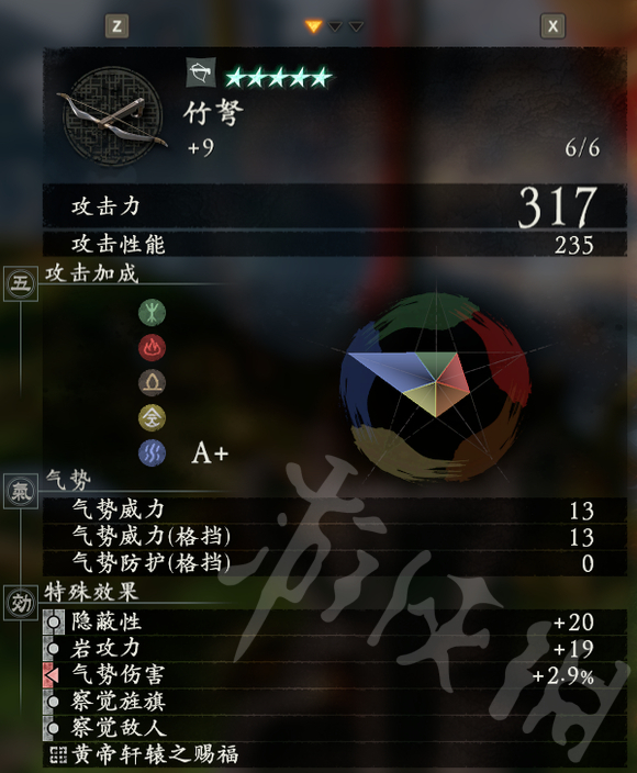 弓可以帶兩個相同的賜福或者套裝,都算,但是其他屬性就只有切到手上的那把才會加。所以對比了一下,主手只有竹弩的固定詞條稍微有點用,副手弓就隨意了,只要有套裝詞條就行。