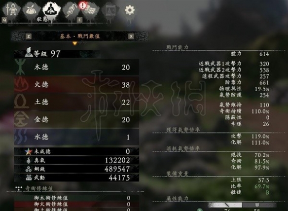因為一周目通常還不會有那麼多的屬性點所以配點邏輯我建議以要習得的技能為第一優先,接著要血量就點木,絕技流多點火,負重點土(100%/70%/30%),遠程奇術流一周目我覺得還玩不太起來所以不用為此點金,水效益最低沒事別點。