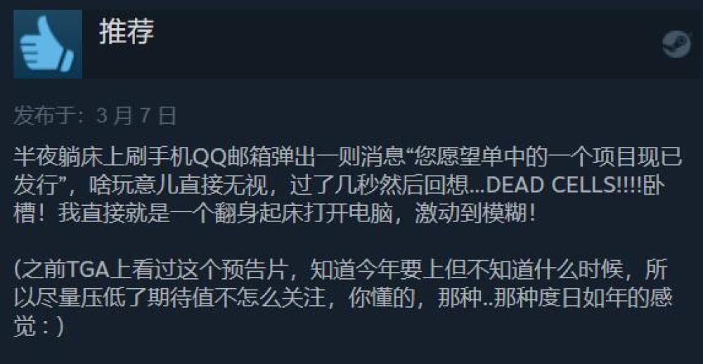 半夜躺床上刷手機QQ郵箱彈出一則消息「您願望單中的一個項目現已發行」,啥玩意兒直接無視,過了幾秒然後回想...DEAD CELLS!!!!卧槽!我直接就是一個翻身起床打開電腦,激動到模糊!