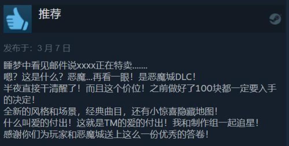 玩家評價方面,絕大多數玩家都給予了好評,表示對這個DLC非常期待,全新風格和場景,經典的曲目,還有隱藏地圖小驚喜,簡直是愛的付出。而DLC的價格也是非常的良心。有網友評價說Konami總算是幹了件人事,但即使如此,他還是要FxxK Konami。