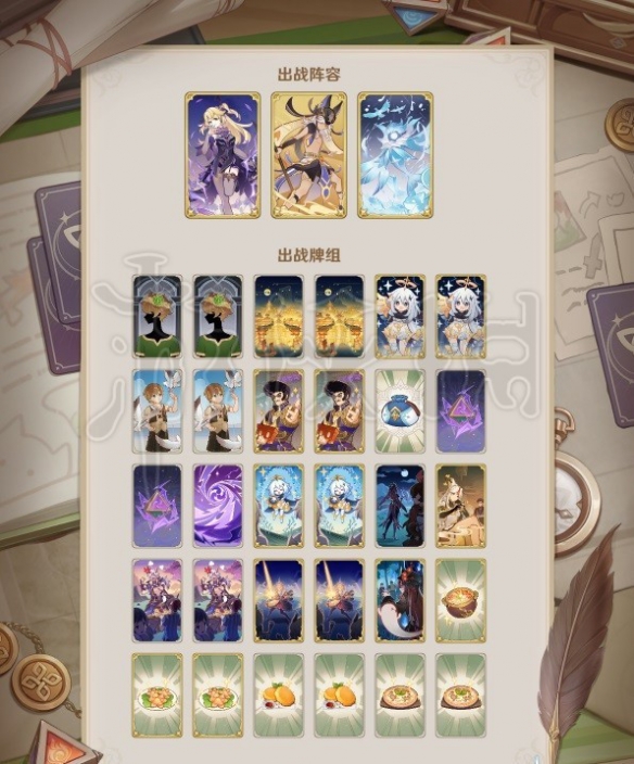 大派蒙/立本為本套牌的絕對核心,一般起手建議最少留1張,最多留2張。伴隨著開局純水精靈5骰元素戰技,一般靠自己運氣是丟不出來的,所以需要小派蒙改骰子來讓我們打出這種操作,也是相當重要的一張牌。