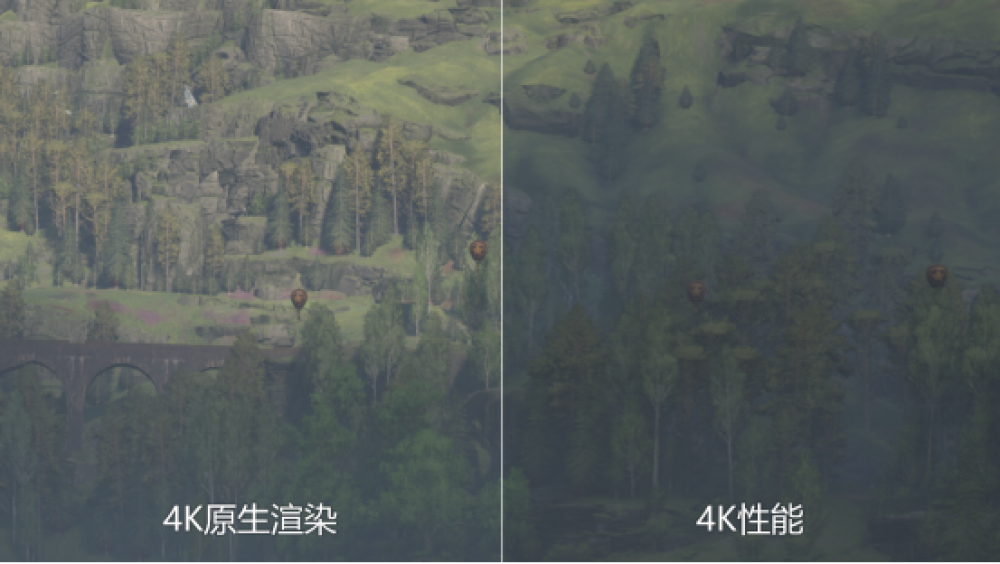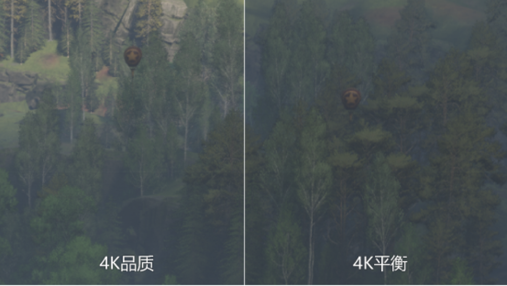 首先出場的是原生渲染與DLSS 3效能模式的對比。由於效能模式的實際渲染解析度只有1080P,我們可以很明顯地看出在效能模式下樹木之間的間隙已經很難辨認,同時岩石紋理帶來的立體感也十分稀薄,氣球的渲染質量就更不用說了。