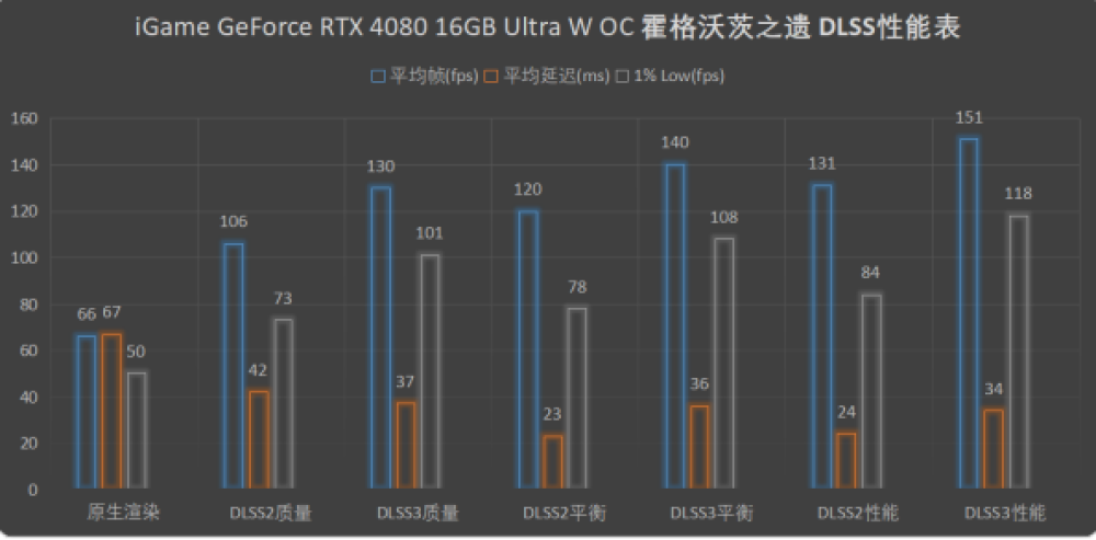 儘管由於4080的測試專案也同樣在4K解析度下進行,成績相比4090有一定的差距,不過即便如此在原生渲染的情況下也依然能夠保持全程穩定在4K 光線追蹤60幀的基本流暢體驗,開啟DLSS3的質量模式後也能夠保證4K 120與砍半的低延遲體驗,遊戲效能直接翻倍!遊戲中的表現還是十分強勁的,而在DLSS 3的效能模式下,這張顯示卡體驗可以達到4K 151幀的優秀表現,同樣也能滿足4K 144Hz高刷屏的需求了。