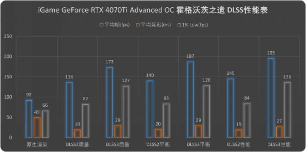 甚至在DLSS 3質量模式下iGame GeForce RTX 4070 Ti Advanced OC就能做到幀數翻倍來到了173幀,直接就能滿足大部分玩家的2K 165Hz高刷電競顯示器,而DLSS 3效能模式下幀數直接飆升到約200幀!看來這張顯示卡在2K解析度下完全可以無所畏懼的暢玩,所以我們同樣推薦這張顯示卡在2K下開啟DLSS 3質量模式,並視情況進行一些畫面上的修改以保證高刷體驗。