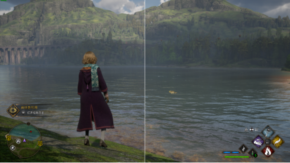 我們選擇的場景是霍格沃茨周邊的森林。DLSS對這個場景的主要影響在湖對面的山上,包括岩石、樹木和氣球的材質以及對環境的渲染。儘管由於遊戲中的日月變化,在我們截圖時光影表現有一定的影響,但這並不影響我們做出結論。