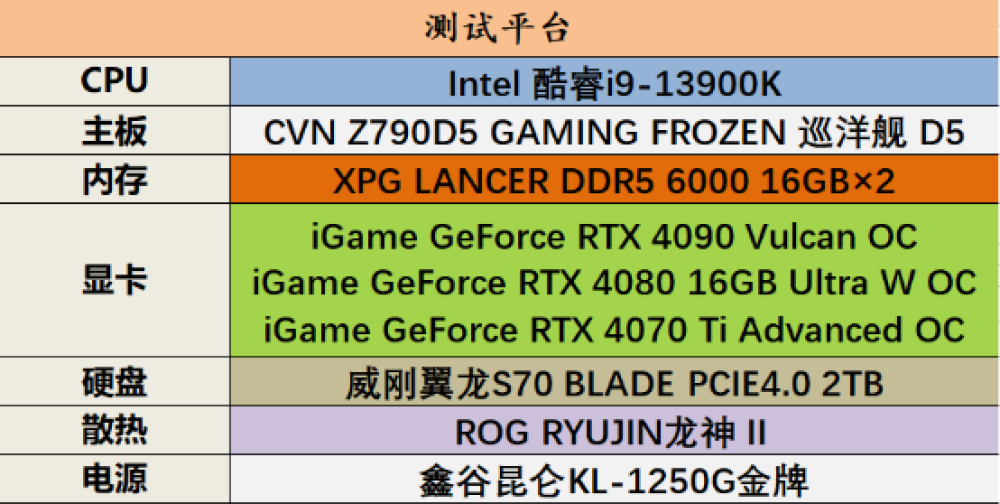 處理器採用了i9 13900K,8大16小的24核32執行緒處理器,它擁有36M 快取記憶體,且睿頻至高可達 5.80 GHz,是遊戲玩家的不二之選。主機板採用了七彩虹的CVN Z790D5 Gaming Forzen巡洋艦 D5主機板,採用16+1+1相數字供電設計,能夠完全發揮i9 13900K的實力。32G雙通道DDR5 6000高速記憶體、2TB PCIe 4.0固態硬碟以及頂級水冷散熱器與1250W金牌電源也確保了所有測試中只有顯示卡作為影響效能的唯一變數。