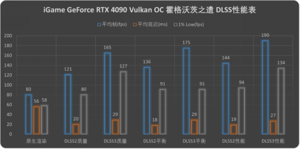 如此強悍的顯示卡效能自然可以帶來絕佳的遊戲體驗:即使採用完全原生的渲染方式,在霍格沃茨之遺中4090也仍然擁有80幀的平均幀數表現,可以說是十分暴力了。而且即使只開啟到DLSS 2的質量模式,平均幀數表現也能直接拉到4K 120幀的水平,而在此基礎上開啟DLSS 3倍幀,連1%Low都拉到了120Hz水平,平均幀更是直接飆到165幀,足夠餵飽4K 144Hz規格的頂級電競顯示器。同時,無論是否開啟DLSS 3倍幀功能,延遲都從原先的56直接砍半到不到30,而我們再開啟DLSS 3的“效能模式”後,平均幀數直接來到了接近200幀的水平,幀數直接翻了2.3倍多!