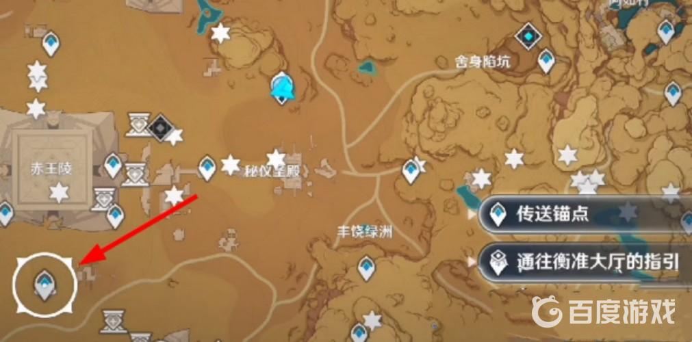 1、我們開啟須彌沙漠地圖,找到下圖的傳送點,點選會有額外的【通往衡準大廳的指引】,點選傳送。