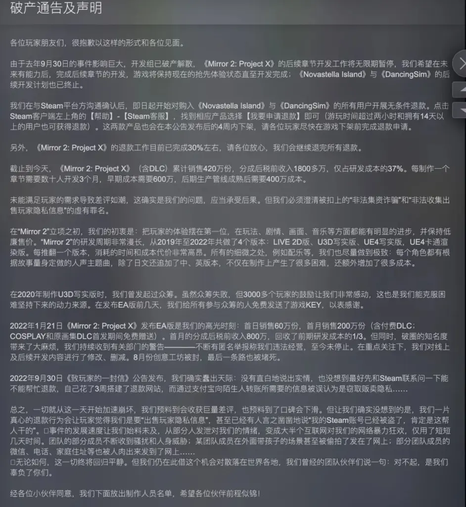 Mirror2製作組今日釋出宣告,受去年9月30日事件影響以來,開發組逐漸走向破產解散。《魔鏡 2:X 專案》的後續章節開發工作將無限期暫停,遊戲將保持現在的搶先體驗狀態直至開發完成;《新星島物語》與《DancingSim》的後續開發計劃已終止。現對已購買相關產品的玩家開放無條件退款。