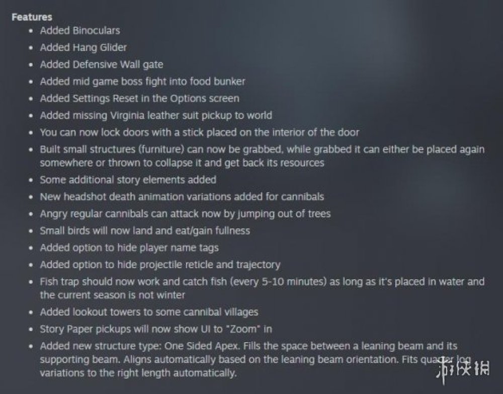 《森林之子(Sons Of The Forest)》的首個補丁更新今日釋出,為遊戲追加的新內容包含新的迷你Boss戰、新的雙筒望遠鏡、懸掛式滑翔機、防禦牆門和門鎖等,並進行了一些平衡性改動和錯誤修復,確保玩家能夠獲得流暢的遊戲體驗。