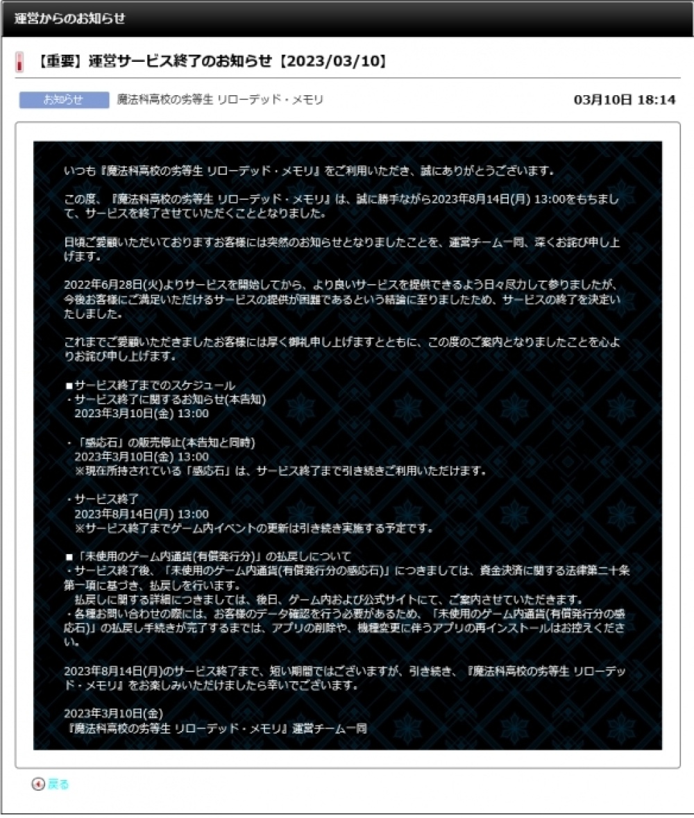 SQUARE ENIX宣佈旗下根據TV動畫《魔法科高校的劣等生》改編的手遊《魔法科高校的劣等生 Reloaded Memory(魔法科高校の劣等生 リローデッド・メモリ)》將於8月14日停服。