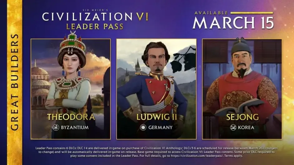 《文明》官推公佈了《文明6》季票新領袖的資訊,拜占庭皇后「西奧多拉」、巴伐利亞國王「路德維希二世」和朝鮮王朝「世宗大王」,新領袖將於3月15日正式登陸游戲。