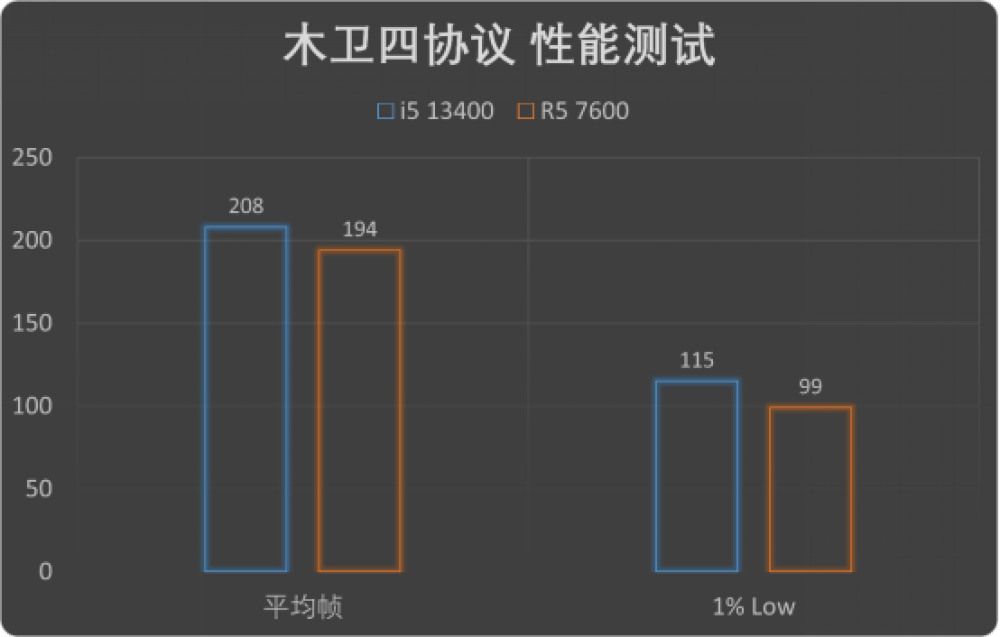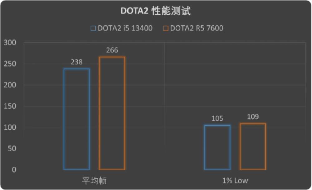 DOTA2與CSGO同樣基於起源引擎開發,但它在技術上更為先進,支援了DX11與Vulkan這樣的現代圖形API。與此同時,其MOBA遊戲在激烈團戰中各種物理特效也使得它對電腦的效能提出了更高的考驗。這款遊戲也是我們測試的四款網遊中唯一一款i5 13400能夠接近銳龍5 7600成績的,平均幀只相差28幀,1% Low也只相差4幀。