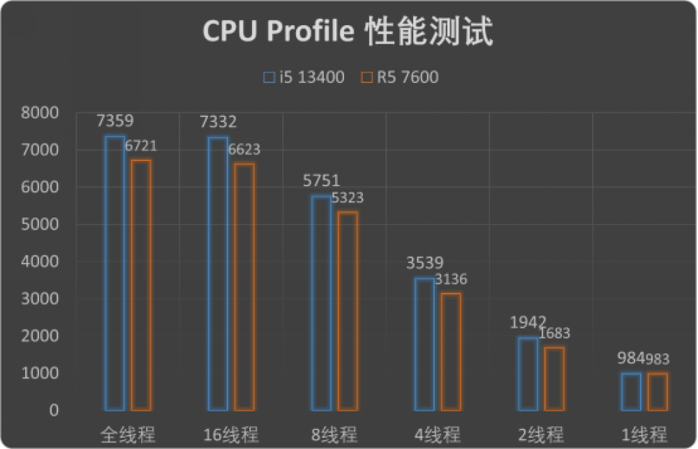 首先是3DMark的CPU Profile測試。由於這項測試會測試多種不同情況下的CPU效能表現,這項測試會更貼近遊戲玩家的實際應用。在這項測試中,兩顆處理器的效能表現沒有拉開十分顯著的差距,考慮到銳龍5 7600僅有六個核心在這類多核心測試中存在天然劣勢,這種表現已經可以說是十分強悍了。