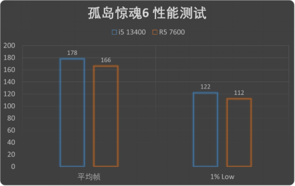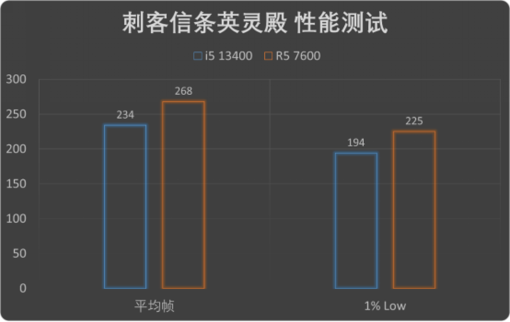 當然,育碧的遊戲,別的不說那優化自然是一等一的。銳龍5 7600的表現十分優秀,而i5 13400則在此基礎上更上一層樓。平均幀高了12幀、1% Low高了10幀。當然了,對於一款不考慮多人對戰的遊戲來說,無論是哪顆處理器都能夠流暢遊玩。