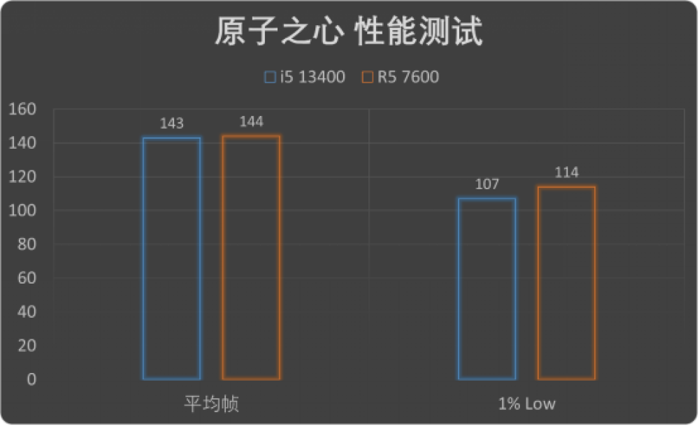 來看看效能測試。由於這款遊戲的優化表現十分優秀,兩顆處理器的平均幀表幾乎完全一致,只在1% Low上存在區別,銳龍5 7600在這款遊戲中還是表現更為穩定一點。對於原子之心這款在遊戲體驗上頗似舊時代硬核動作遊戲,時常需要抓timing閃避的遊戲來說,更穩定的幀數表現確實能夠提升玩家的遊戲體驗。