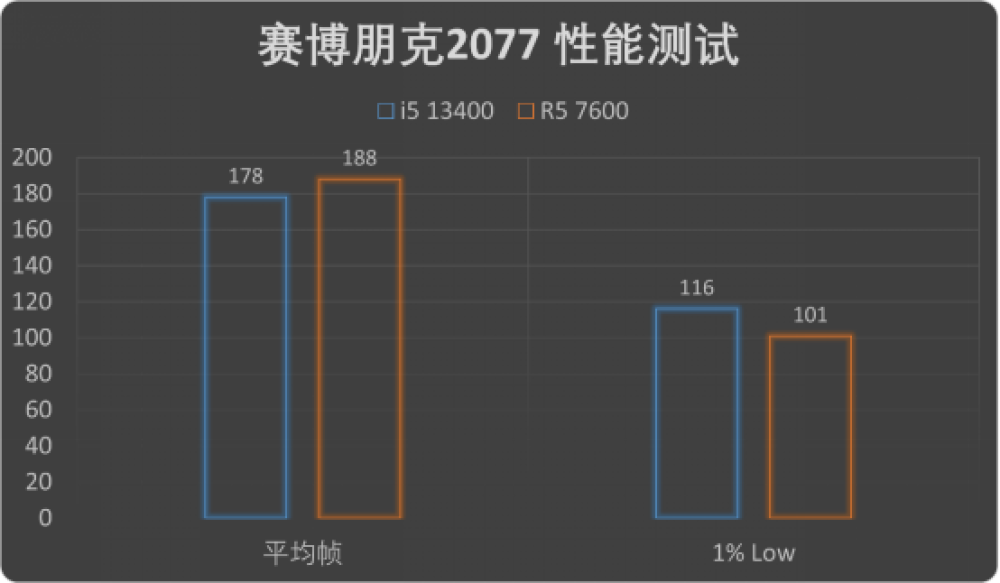 總之來看資料。由於2077是一款更注重顯示卡效能的遊戲,即使將所有畫面設定拉到最低,使用RTX 4090顯示卡,兩顆受測的處理器在1080P下也難以衝到200幀以上。銳龍5 7600在平均幀上有一定的優勢,而1% Low方面i5 13400的表現會更為穩定。當然,對於賽博朋克2077這樣一款主打劇情體驗的遊戲來說,1% Low的優先順序還是沒有平均幀那麼高的。