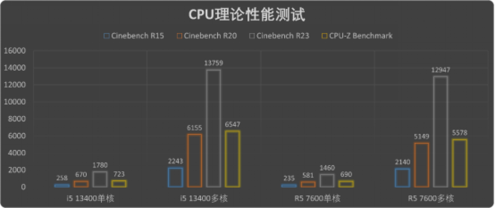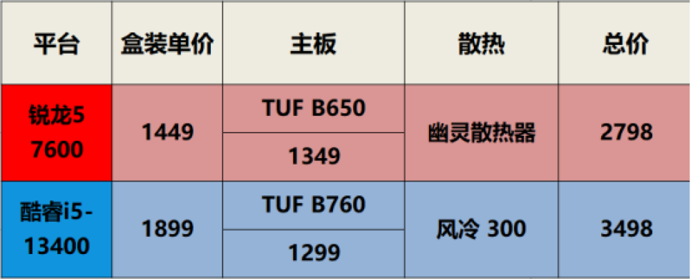 我們根據目前市場上的價格大致估計了一下選擇兩顆處理器在購買時的成本。根據測試資料我們可以發現,在遊戲效能上,銳龍5 7600的綜合表現要遠強於i5 13400,尤其是在網路遊戲上,而13400在理論生產力效能上的優勢卻難以抵消在實際遊戲效能上幾乎是全軍覆沒的劣勢。同時,考慮到銳龍5 7600的盒裝自帶一個經典的、足以應對它發熱的幽靈散熱器,英特爾平臺需要自行選購散熱器,以及AM5平臺在未來至少五年內的長期升級空間和LGA 1700平臺已經走向生命末期,即使對於更注重生產力效能的使用者來說,在組裝新機器時選擇銳龍5 7600都是一個更為合理的選擇。