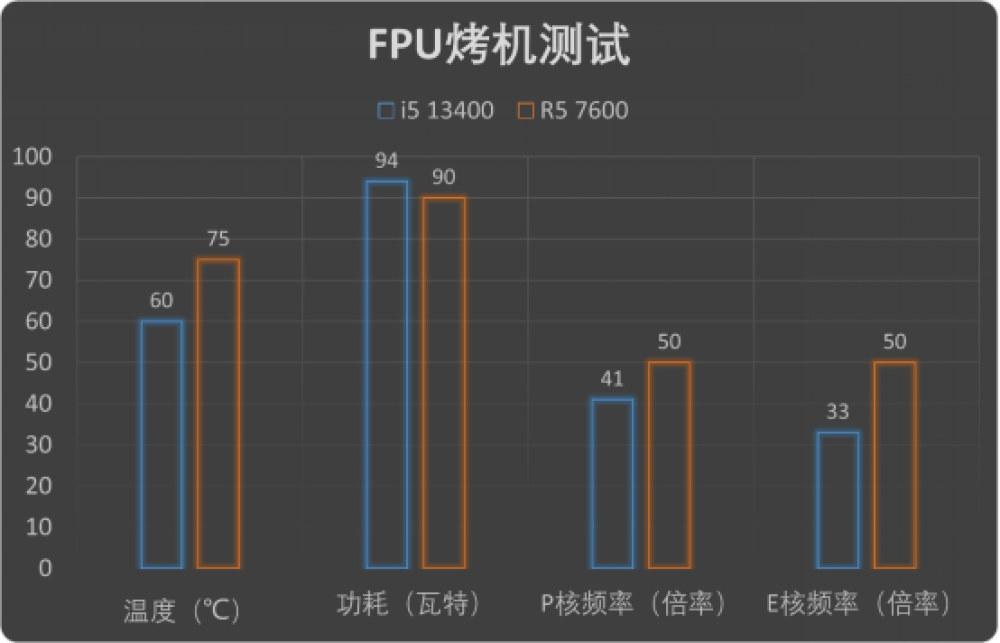最後,我們來烤個機。在BIOS中關閉所有效能提升機制,並使用AIDA64進行30分鐘FPU烤機的結果如圖所示。需要注意的是,由於銳龍5 7600不存在大小核設計,P核和E核的成績都是一樣的。且為了保持圖表的可讀性,我們記錄的是倍頻,需要乘以100才能得到頻率。在文章裡,所有的資料都已經經過換算。總之,我們來分析一下。兩顆CPU的能耗表現都十分不錯,AMD的銳龍5 7600跑出了90W的功耗,全核5GHz,在我們龍神2水冷的壓制下溫度表現75攝氏度,表現還是比較優秀的;Intel這邊的i5 13400的表現也十分驚人,94W的功耗下大核4.1GHz、小核3.3GHz,且溫度控制在60攝氏度,這方面可以說是略勝一籌。