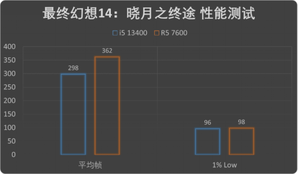 最後一款網遊是一款長期運營的MMORPG,最終幻想14。遊戲僅支援DX11,且效能要求不低。銳龍5 7600仍然保持著它在網遊領域的優勢,以362幀的平均幀仍然領跑比賽。同時,兩顆處理器的1% Low表現接近,這意味著銳龍5 7600的優秀表現不會以團戰中突然的掉幀卡頓為代價。