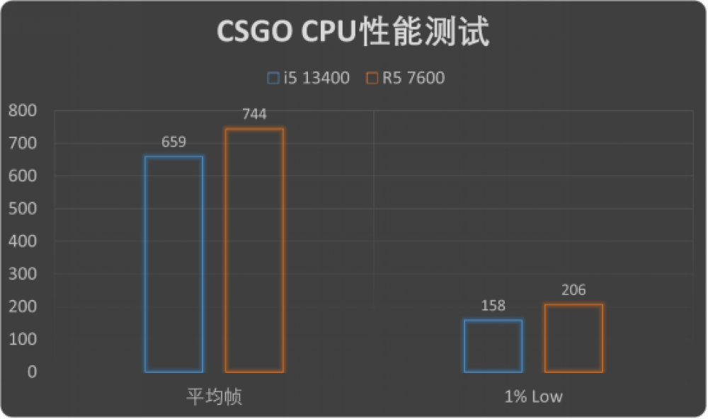 先來看看幾款網遊。CSGO作為所有受測遊戲中技術層面最落後的遊戲(在2023年仍然僅支援DX9/OpenCL),效能表現與CPU高度掛鉤。在遊戲中,銳龍5 7600以顯著的優勢勝過了i5 13400,這也符合我們在前面3DMark效能測試中看到的趨勢。