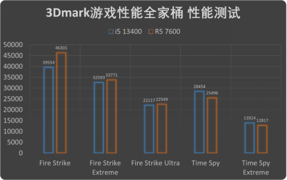 其次是3DMark的遊戲效能理論基準測試,很有趣的一點是銳龍5 7600在DX11的遊戲效能測試中反殺了i5 13400,其中1080P DX11的Fire Strike測試中出現了最大的效能差距。在2K的FSE/TS與4K的FSU/TSE中,效能差距有,但仍然不算特別明顯。