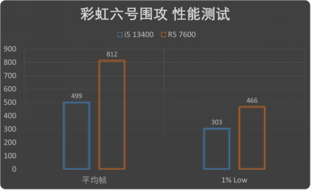 彩虹六號作為育碧旗下的老牌戰術FPS網遊,憑藉擬真的戰術射擊玩法與優秀的畫面特效飽受玩家們的好評。在步入到運營週期第八年的現在,這款遊戲已經擁有了包括Vulkan圖形API、NVIDIA DLSS等先進圖形技術的支援,遊戲體驗也得到了充分的打磨。在我們的測試中,銳龍5 7600在這款遊戲中取得了最顯著的效能提升,無論是平均幀還是1% Low都近乎翻倍。說實話,以這個優勢來說,如果你是一個玩彩虹六號的玩家,看到這裡就可以關掉頁面開啟京東下單了。