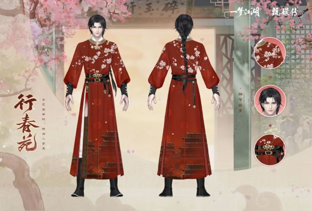 這次聯動《一夢江湖》為我們帶來了瀟灑的男裝·笛落梅與柔美的女裝·舞驚鴻。男裝·笛落梅是一襲端莊錦袍設計,肩頭斜支一束憑風飄拂的梅花,淡雅的粉色傾瀉著早春的無限溫柔。下襬的硃紅色緞面之上,層疊的紅牆金頂紋樣莊重肅穆,使衣袍整體呈現出古樸而又華麗的視覺效果。