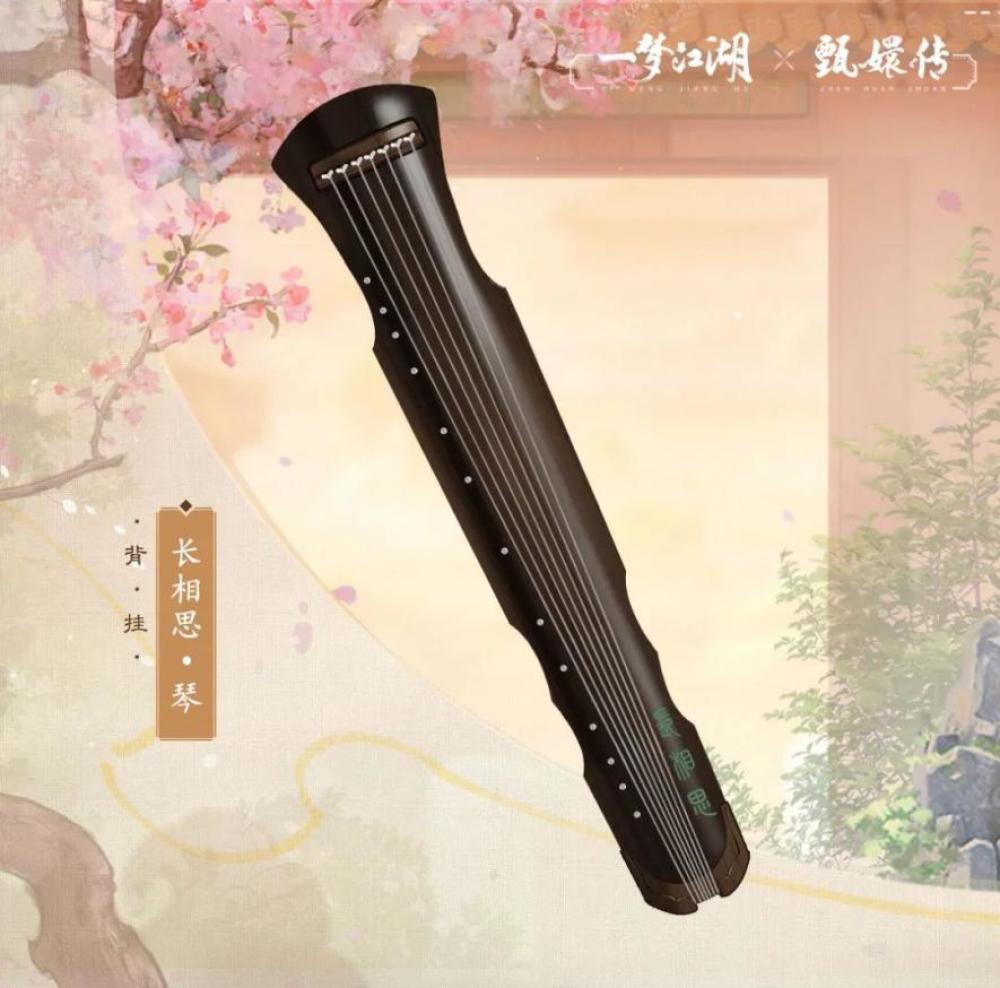 不僅如此,《一夢江湖》還為我們製作了兩款樂器,背掛長相思·琴是一把外觀古樸優美的伏羲式七絃琴,腰項處皆有半月形彎入,檀木質地的琴面經過精細雕刻與裝飾,刻有“長相思”三字。演奏時深沉曠然,有縹緲之聲。