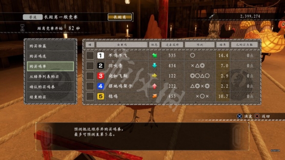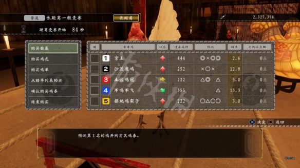 關於賽程,最好只玩長距離,長距離爆種的情況最少,中距離變化太多,遇到直接不買開賽,進賽雞場之前記得先存檔。可以直接看末尾的結論,另外從賠率列表購買的時候,買三連和五連的,用左搖桿能快速下拉,十字鍵只能一個個按太慢。
