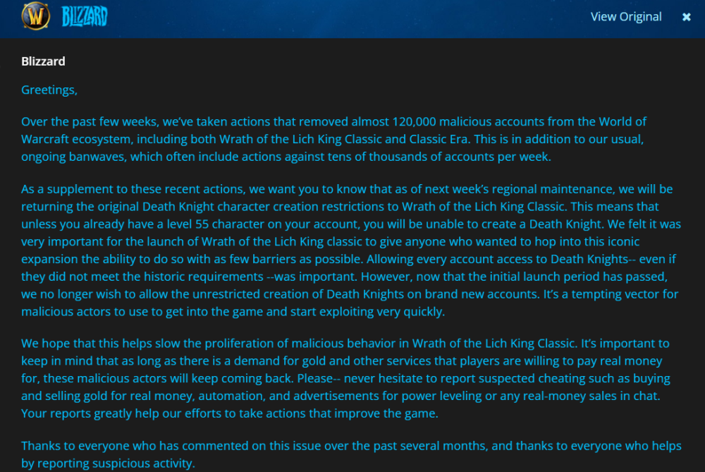 最後,暴雪再次重申了對RMT(真錢交易)的態度,這裡引用NGA的翻譯:“我們希望這有助於減緩《巫妖王之怒經典版》中惡意行為的蔓延。需要記住的是,只要玩家願意用真錢購買金幣和其他服務,這些惡意行為者就會不斷回來。請不要猶豫,舉報涉嫌作弊行為,例如用真錢購買和出售金幣、自動化以及在聊天中釋出的代練或任何真錢銷售。您的舉報極大地幫助我們採取行動,改善遊戲。”