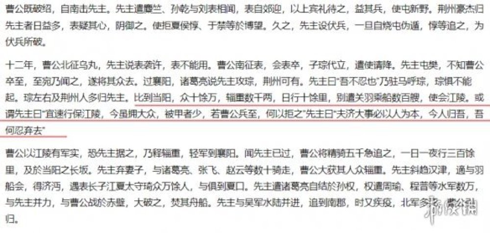 “比到當陽,眾十餘萬,輜重數千兩,日行十餘里……或謂先主曰:‘宜速行保江陵,今雖擁大眾,被甲者少,若曹公兵至,何以拒之?’先主曰:‘夫濟大事,大事必以人為本,今人歸吾,吾何忍棄去!’”