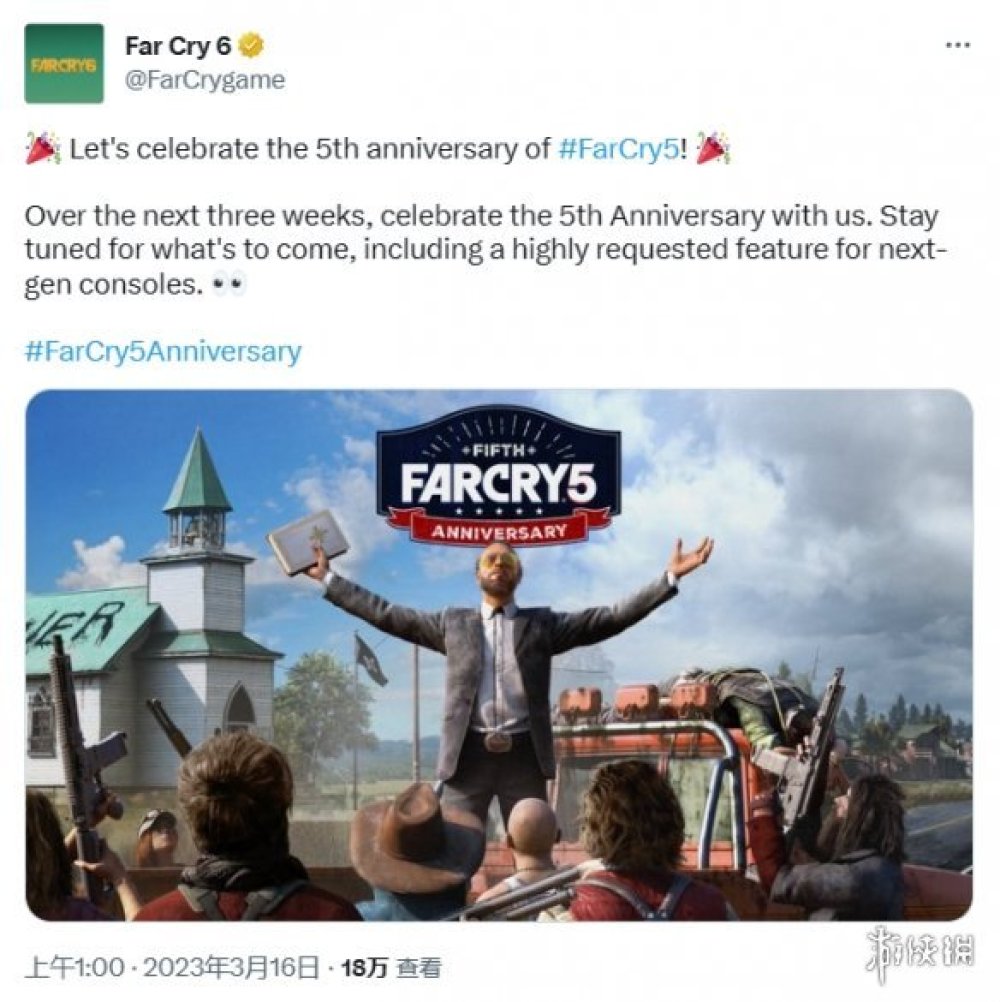 《孤島驚魂5》官推表示,在接下來的三個星期將慶祝《孤島驚魂5》發售五週年,慶祝活動的內容稍後公佈,其中還包括適配次世代主機。