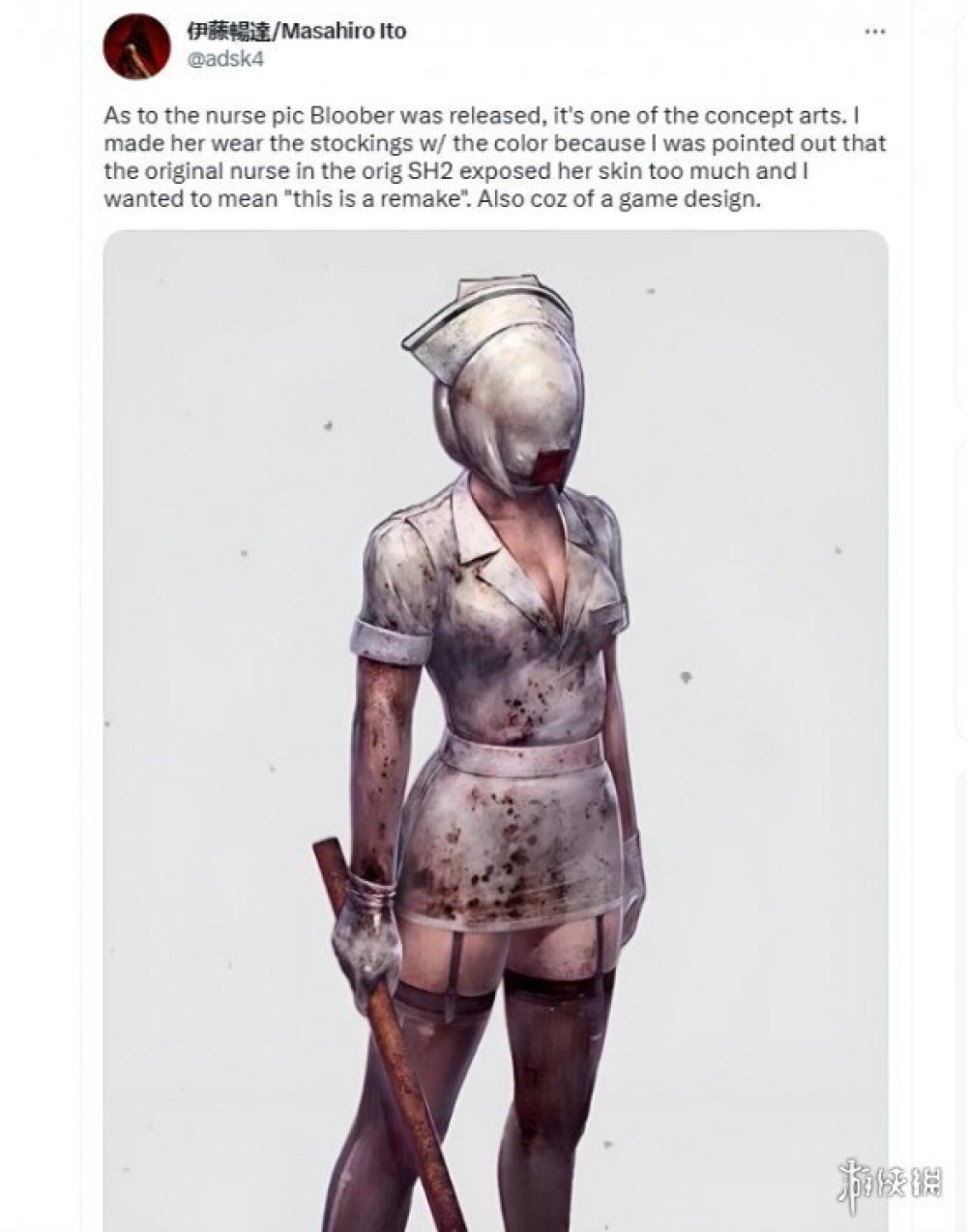 《寂靜嶺2》原版中的標誌性敵人“護士”在《寂靜嶺2重製版》中獲得了新的形象,《寂靜嶺》系列藝術總監和怪物設計師 伊藤暢達 今日在推特上表示,之所以重製版中護士穿上了黑絲,是因為有人指出原版中的護士“露肉太多”。