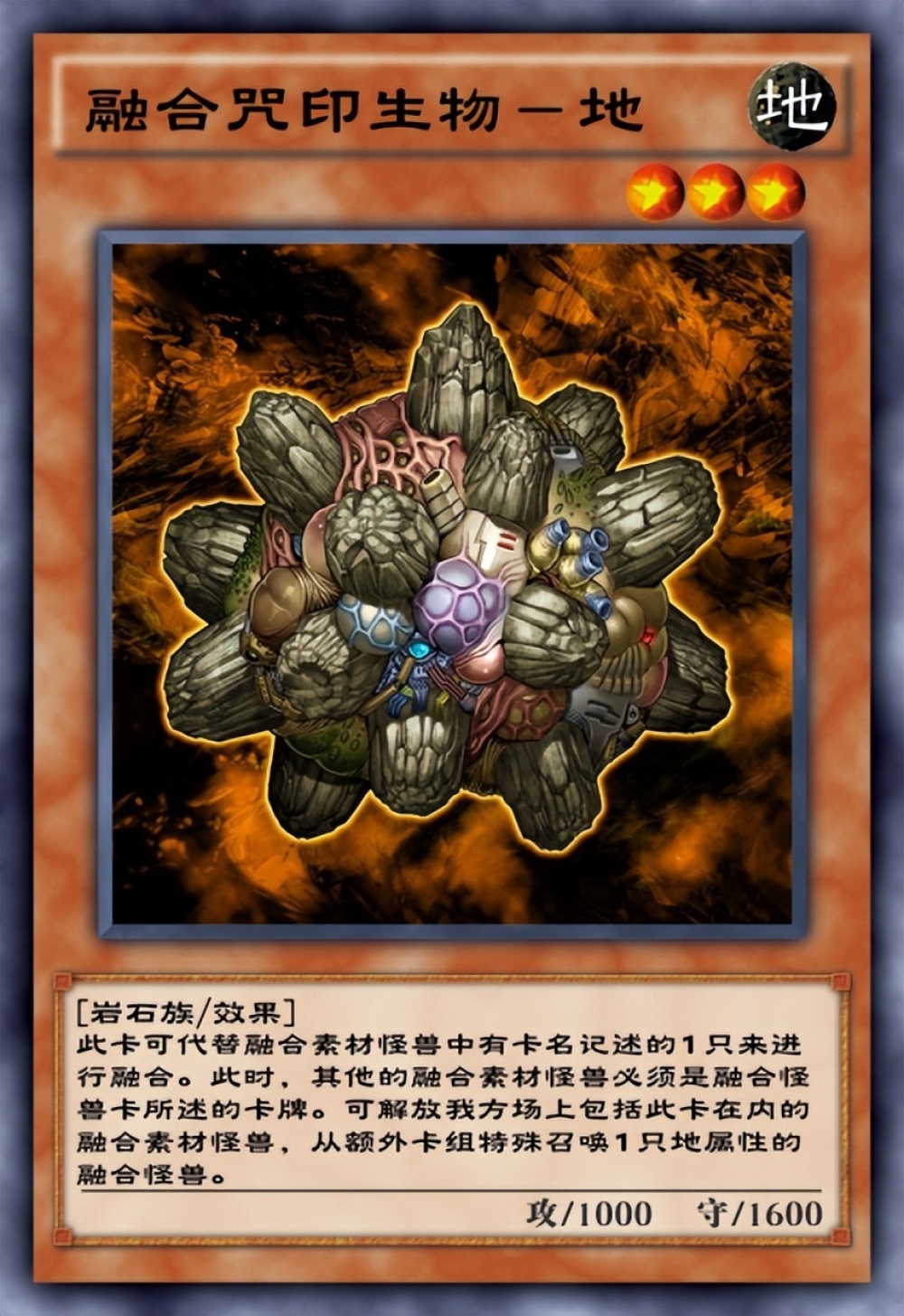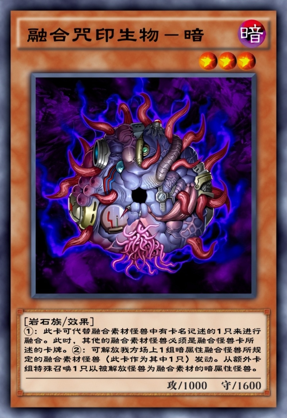 相比於魔神王,融合咒印生物就遜色了一些,這些卡牌雖然也可以代替融合素材,但卻對融合終端怪獸有所限制,不過優點在於可以省下融合卡牌,在融合素材在場的情況下可以直接發動效果融合,在很長一段時間內被運用在各類能夠一拖一的展開類卡組當中,像衝鋒陷陣的隊長等卡牌就與融合咒印生物有著非常不錯的相性,成為了早期萬金油的代表。