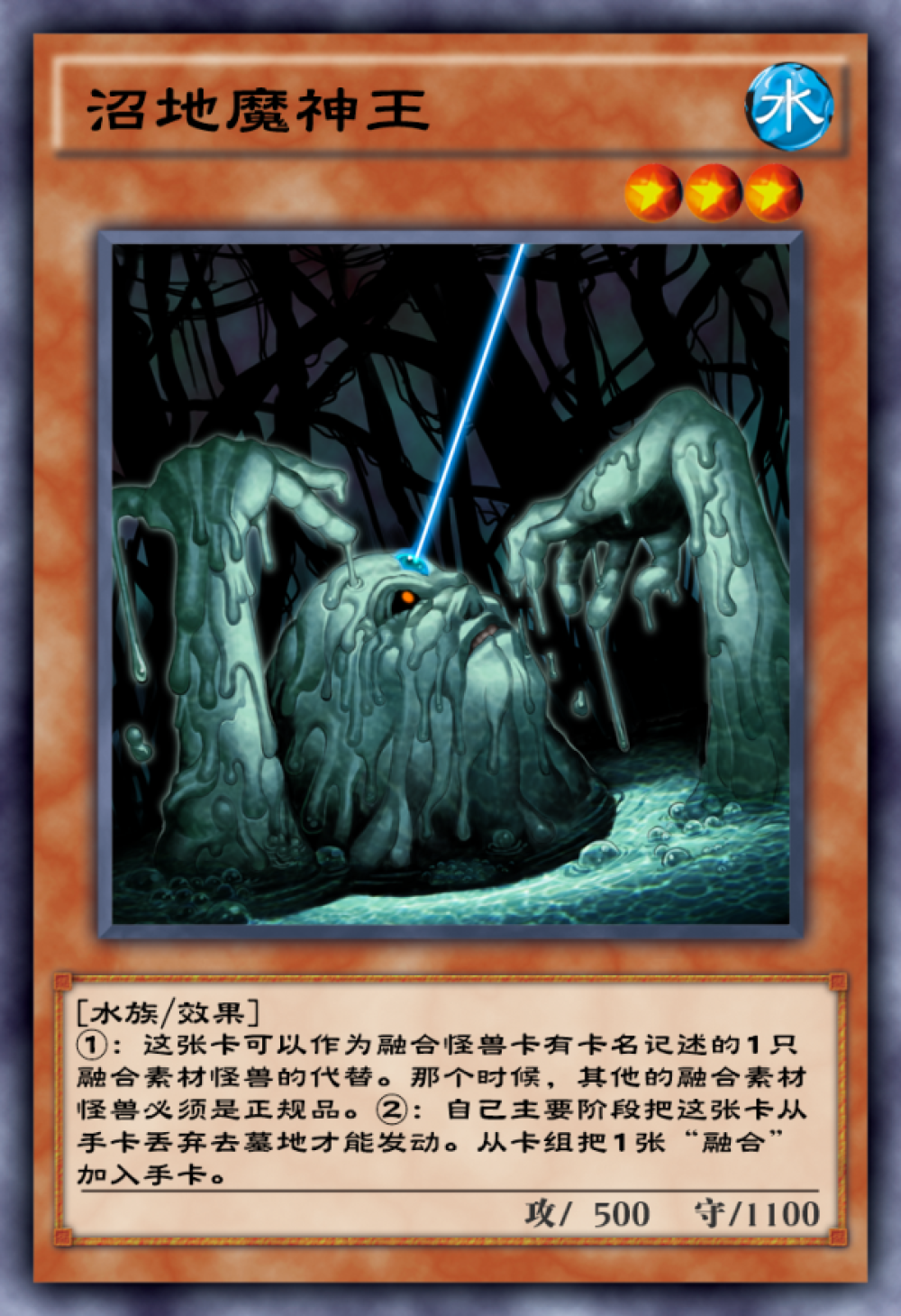 在早期的環境中,融合召喚並沒有現如今的各類進階版融合魔法卡那樣便利,更多的是三換一的虧資源展開,因此官方給到了第一張真正意義上的融合萬金油卡牌——沼地魔神王。這張卡可以作為萬用融合素材來使用,同時也可以通過從手卡丟棄來從卡組檢索融合魔法卡,在那個融合資源很難湊齊的環境中,這張卡可以說是非常吃香,即使是在近些年的環境中,我們依舊能夠看到這張卡的影子。真正讓這張卡崛起還是各類從墓地除外來進行融合的卡牌的出現,像暗影融合等卡牌的出現讓沼地魔神王擁有了更好的發揮空間,在近期的遊戲王決鬥連結國服中也有相當亮眼的表現哦!