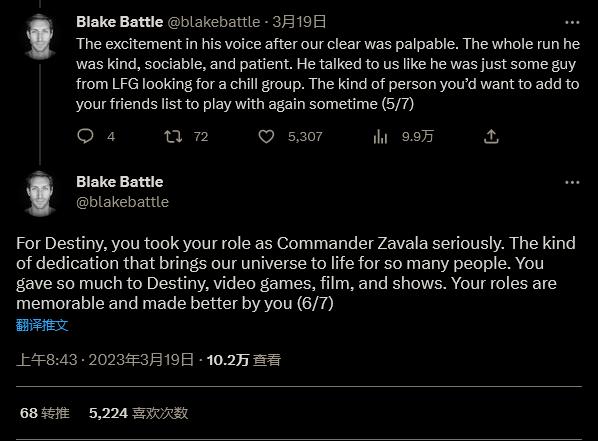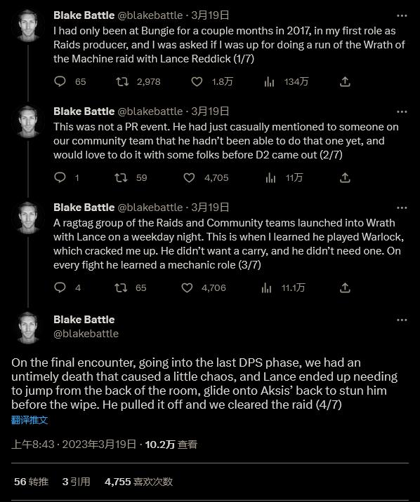 Bungie 專案負責人 Blake Battle 也表達了自己的悲傷,並描述了一段他與 Reddick 一同遊玩時的故事。這是原版《命運》的突襲“機械之怒”開發時的事情。