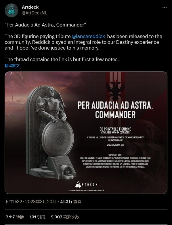 在接受 PC Gamer 採訪時,曾在幾家遊戲工作室有著工作經驗的 Artdeck 表示:“我原本沒有完全意識到我對他建立了多少感情,他通過《命運》成為我日常生活中的一部分。因此當他的離世訊息在推特上釋出後,對我來說是個沉重的打擊,並且仍然讓人感覺難以置信的不真實。我相信社群中許多人都能體會到這種失落和困惑的感覺,不知道怎麼悼念一個你從未真正認識,但仍然在你的日常生活中佔有重要地位的人。”