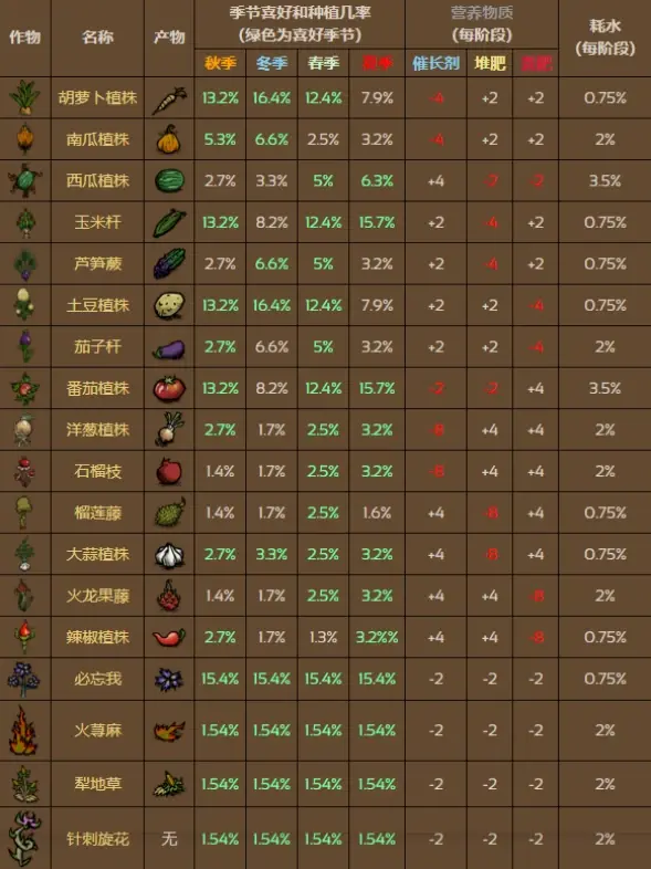 這裡要提一點,每種作物都有自己的喜好季節,在喜好季節外種植,生長所需時間是喜好季節的一倍!!更不容易種植出巨大作物。還是以番茄西紅柿為例子,如果在秋季種植番茄和西紅柿,由於西紅柿喜好秋季,但是火龍果不喜好,就會導致番茄先與西紅柿成熟,導致其生長階段對不上,從而就會導致土壤肥力不夠無法種出巨大作物。
