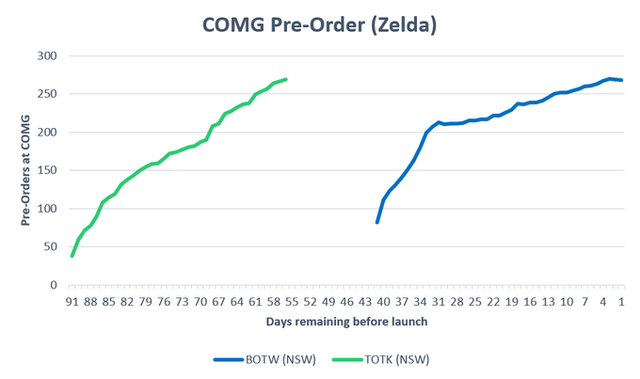 根據推特使用者 Pierre485 指出,日本零售連鎖店 COMG 資料顯示,《塞爾達傳說:王國之淚》的總預訂量已經超過了《曠野之息》。該資料是在 3 月 17 日釋出的,即遊戲發售的 8 周前,因此《王國之淚》的預購量仍然有可能攀升至更高。
