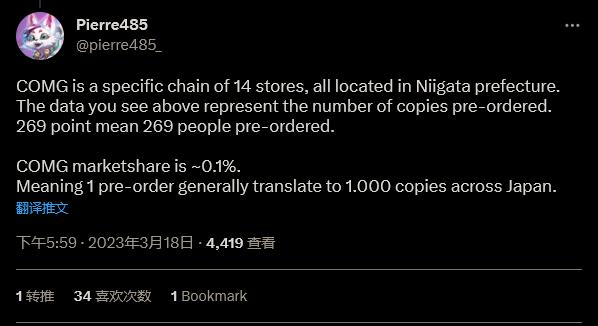 需要注意的是,該數字目前僅來自日本的一家零售商。Pierre485 後續解釋稱,COMG 的市場份額並不大,“SOMG 是一家由 14 家商店組成的特定連鎖店。SOMG 的市場份額約為 0.1%,這意味著每 1 份預購在全日本相當於 1000 份。”