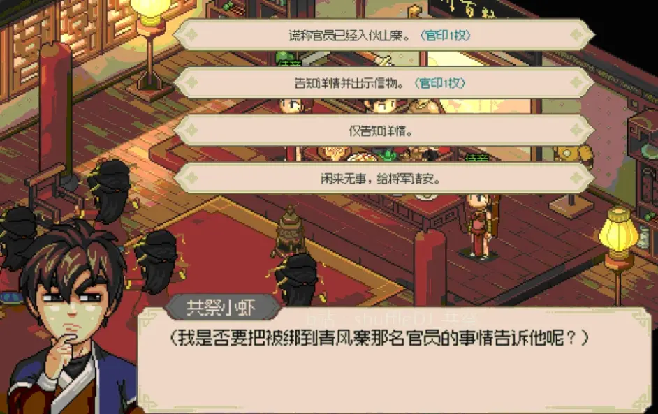 清風寨官員那個其實可以完美解決,只要實力夠強就行了,前面都一樣選到給50貫放人為止。選完以後那個官員就走了,十天以後會鴿子把錢飛給你。然後你別回將軍府交差(反正任務沒有時間限制),等到實力夠強了再去交差,他要殺你發現全家老小一起上還打不過你,然後讓你選擇殺了將軍還是放了,放了就是恩怨一筆勾銷就完事了,甚至關係都不會仇恨。