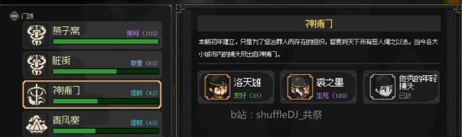 把神捕門刷到敬重(3個主要人物好感儘量刷到不能刷 門派物品多去買一點)