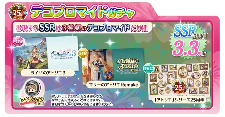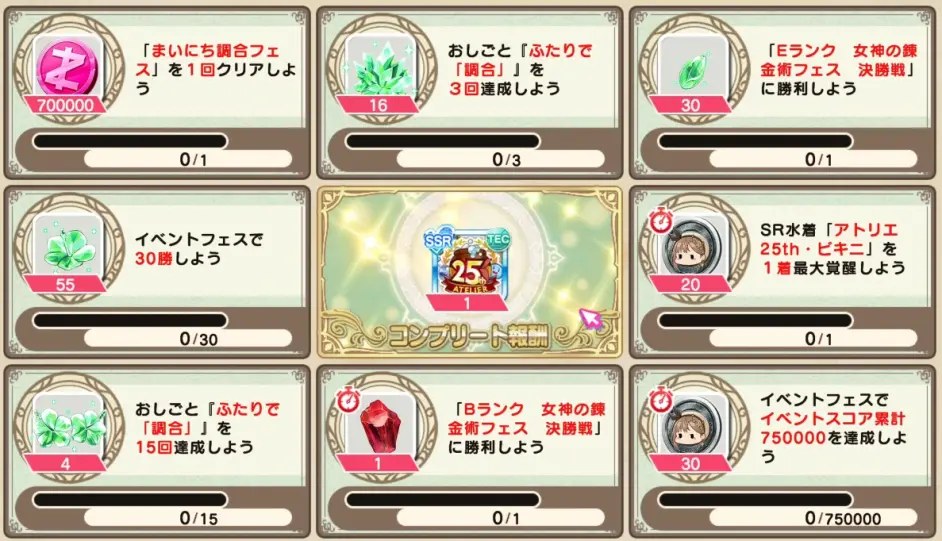 最終獎勵:鍊金工房系列25週年紀念SSR禮裝卡(技巧E)(此卡在卡池中也可抽到)